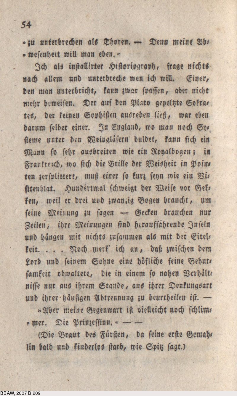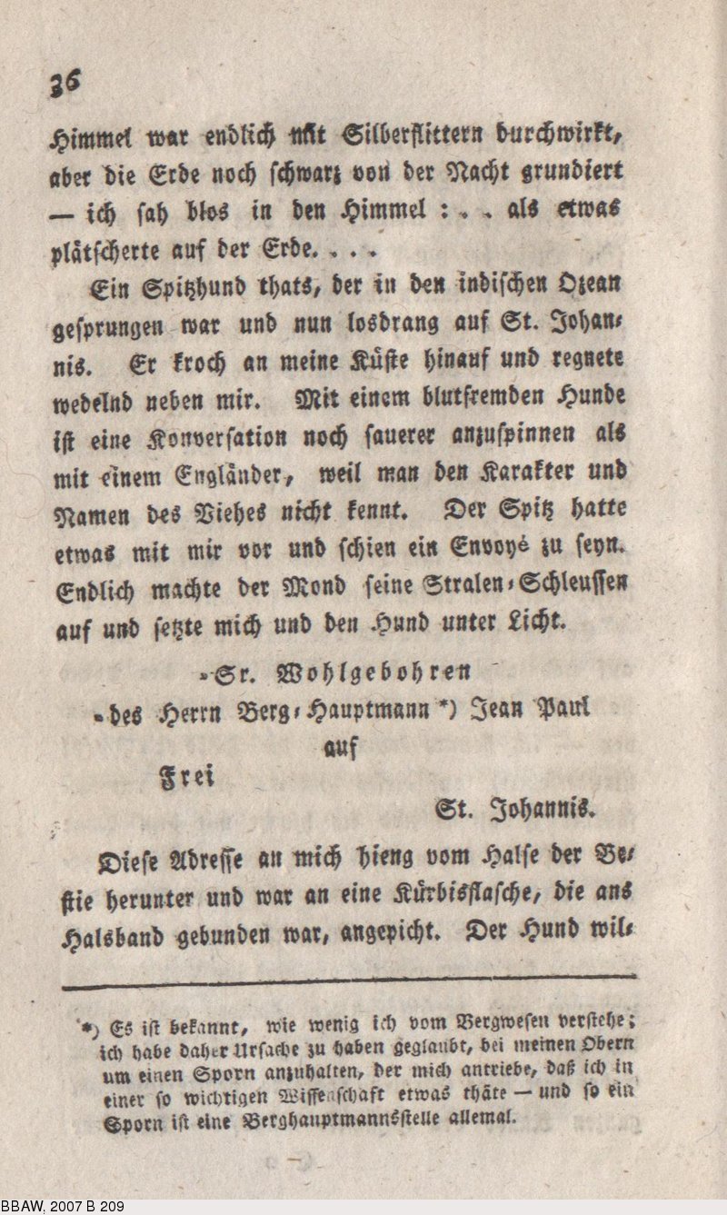 „Durch einige schlechte Wilddiebe und Wildspionen unter unserer Gewerkschaft ist es leider dahin gediehen, daß wir alle mit Stadtarrest belegt sind. Da wir wenig Vernunft haben — indem unsere gröste darin besteht, daß wir saufen und nicht tol sind — so kan ich nichts aufsezen; daher nimt sich mein treflicher Chef und Brodherr die Mühe, für mich Endes Unterschriebnen mehr als Endes Unterschreibenden, eine Supplik zu machen, daß ich meinem Chef folgen dürfe, wenn er nach Welkershausen oder nach Grimmathal geht. Ich kan Attestate von meinem Prinzipal beibringen, daß ich so wenig von der Jagd verstehe als er und daß ich stets hinter seinem Stok der nächste bin; und die einzige niedere Jagd und freie Pürsch, die ich mir erlaube, weil mich der R[eichs] Anzeiger dazu ermuntert, ist zu Zeiten eine Feldmaus. Da ich nun mein Brod bei meinem Brod herrn verlieren würde, wenn er mich nicht ausserhalb des Thors brauchen dürfte, wohin gerade seine Geschäfte mit mir fallen — und da ich sein einziger Viehstand bin und seine Poularderie und Fasanerie und sein Wappenthier; und da Sie ihn gewis halb so lieben als er Sie; und da Sie oft, wenn Sie bei ihm waren, die Gnade gehabt, mich armen Hund zu streicheln und zu sagen: kom Spiz — so verseh ich mich zu meinem Glüksstern und Hundsstern, daß mir verstattet werde, früher als ich zu Schuhen zugeschnitten bin und auf andern Füssen als auf fremden, vor das Thor zu kommen.“ Spiz p. t. Hund bei H. J. P.