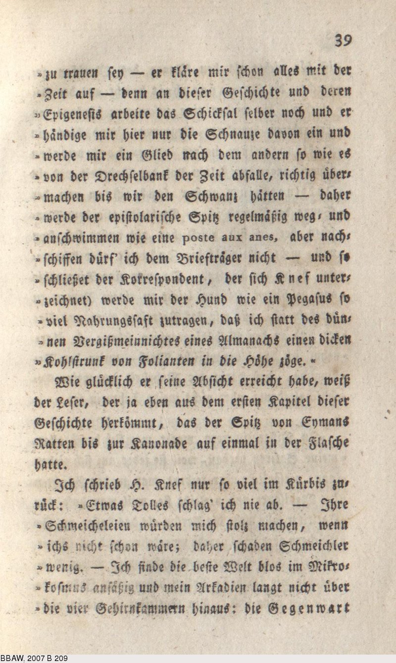 Selber gegenwärtiger Mitarbeiter an der Lebensbeschreibung wurde in dem hohen Begriff, den er sich längst von Fibels Gutmütigkeit gemacht, ungemein durch folgende kleine Pelzische Pinselstriche bestärkt. Der gute Held nahm vor jedem die Jungen ätzenden Vogel den Umweg; er vermied so ängstlich, falsche Erwartungen in seinem Seidenpudelspitz* zu erregen, daß er, da derselbe von allem Eßbaren seinen Bröckchen-Fleischzehend erhob, ihn an ungenießbare Sachen, z. B. Obst, das er aß, riechen ließ, damit sich Spitz auf nichts vergeblich spitzte. Trugen hingegen Täuschungen zum Glück des Hundes bei, z. B. dessen Voraussetzungen unter Fibels Ankleiden, mitlaufen zu dürfen: so ließ er dem Hunde das Hoffen und sagte nur beim Abgehen: zurück! und fragte jeden: warum dem Tiere die kurze Lust nicht gönnen? Aus derselben warmen Herzens-Quelle springt auch seine Sitte, Spitzen, der alles Beste ohne rechten Genuß auf einmal durch die Gurgel jagte, dadurch zu einem feinern Lebens-Genuß zu zwingen, daß er z. B. die Fleischstücke, in gebrochne Brüche zerfällt, überall in der Stube umhersäete und ihn so nötigte, nicht nur mehrere kleine Hoffnungen, sondern auch Bissen mit wahrem Geschmacke zu verzehren.