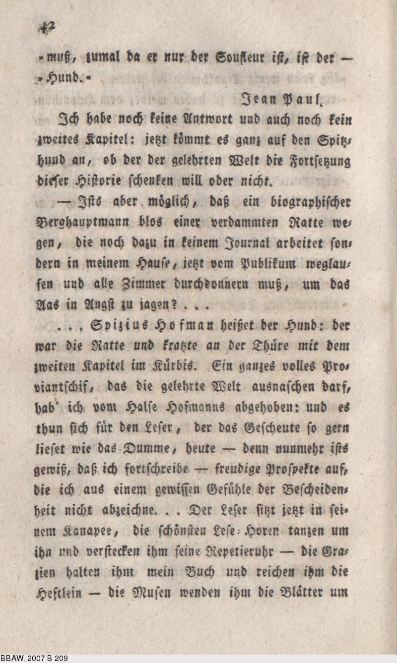 Richter, so war’s, ließ einen Bogen von dem Dir verheißnen Büchlein kaum zur Erde fallen, als Spitz Richter – wie ein unvernünftiger Rezensent – darüber herfiel und es zerbis und zerzauste.