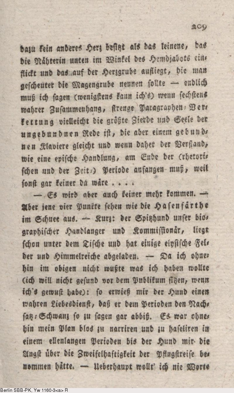 Es ist der Mühe werth, noch eine Nach-Nachschrift anzuleimen, blos um Ihnen von dem Jammer einen Begriff zu geben, der mich nun festhält, seit mein letzter gebissener nie beissender Spitz vom Fallmeister entkleidet und geschunden worden; indem ich wöchentlich andere Novizen-Hunde zur Probe nehme (z. B. vom Fallmeister selber ((wer ist nicht ein Meister im Fallen)) einen herrlichen zu jungen Bullenbeißer) welche aber sämtlich (z. B. eben der heutige jetzige schwarze Jung-Spitz) abgehen müssen blos weil sie ihren Abgang in die Stube lassen. Überall Denkmäler und nirgends ein Hund! Mich schlägts nieder genug. Heute den 1. September habe endlich einen niedlichen Schooßspitz erstanden.