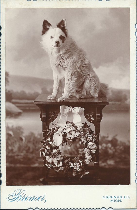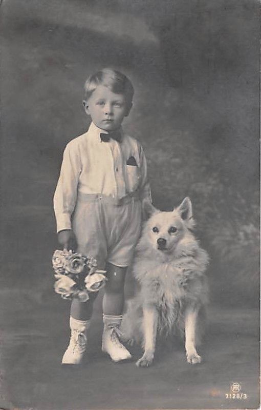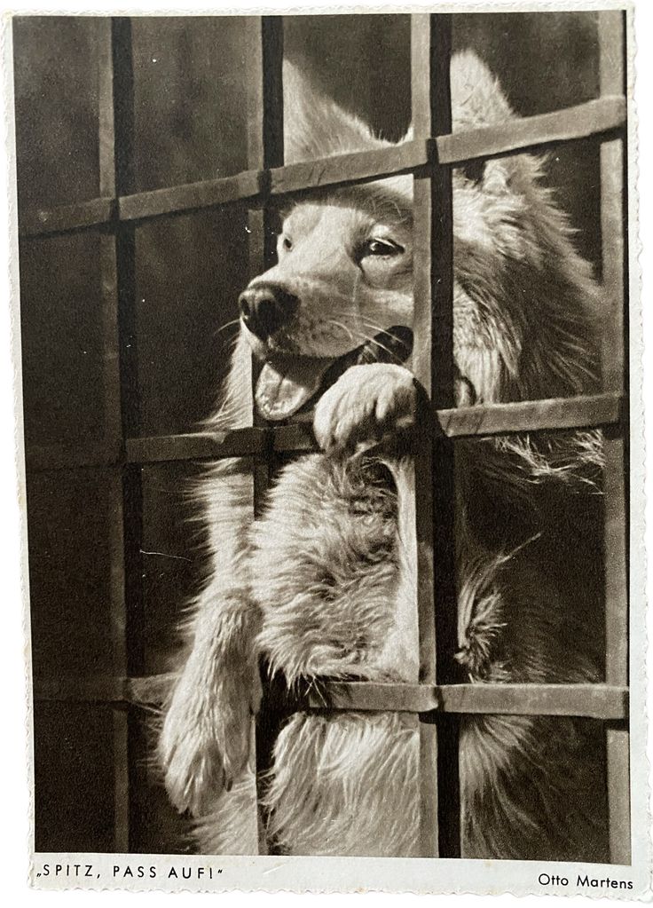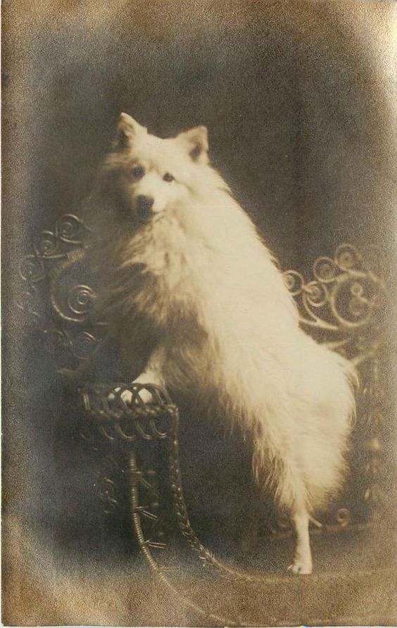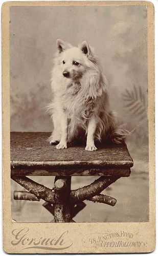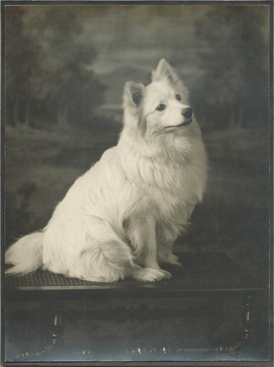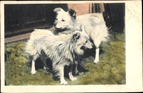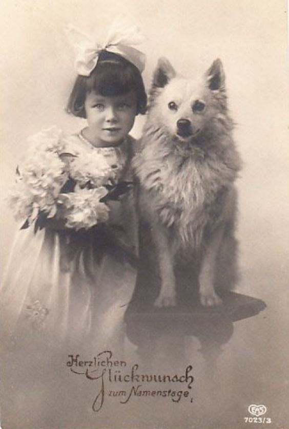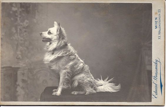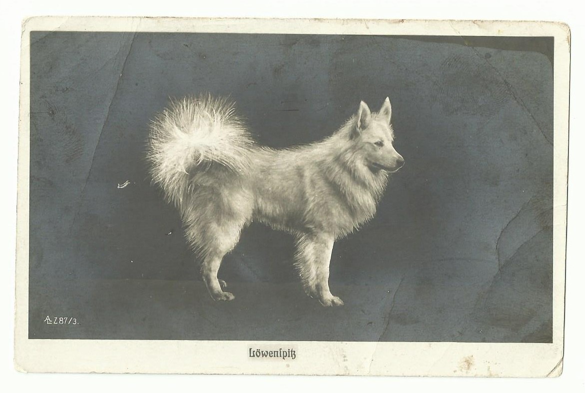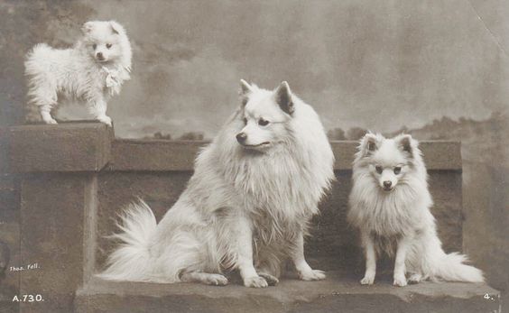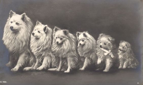 Diese Seite präsentiert eine Galerie historischer Fotos und Postkarten, auf denen Spitze und spitzartige Hunde abgebildet sind.