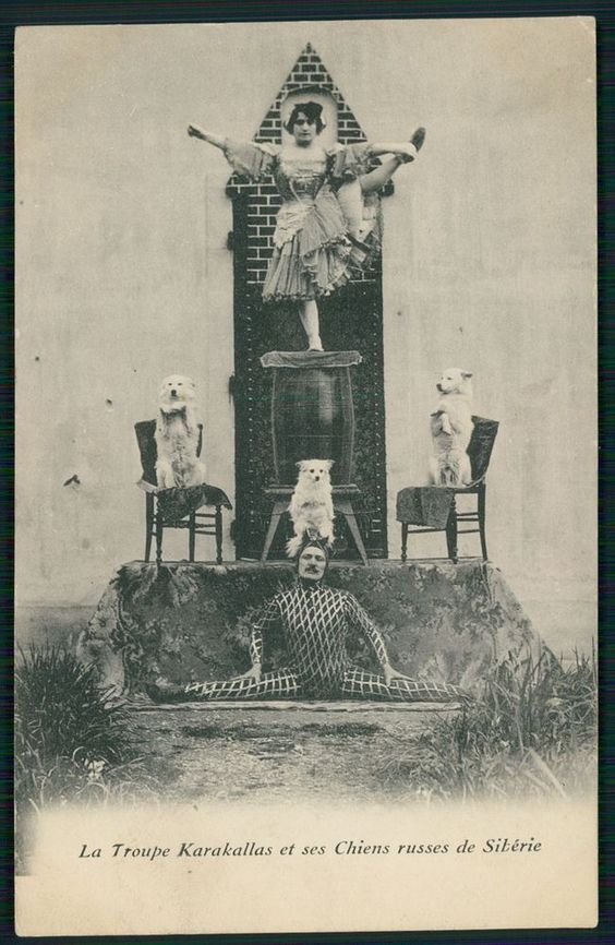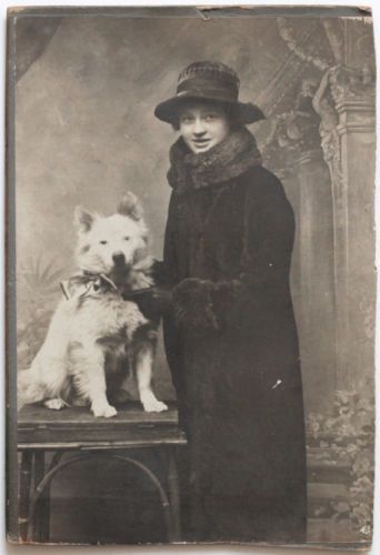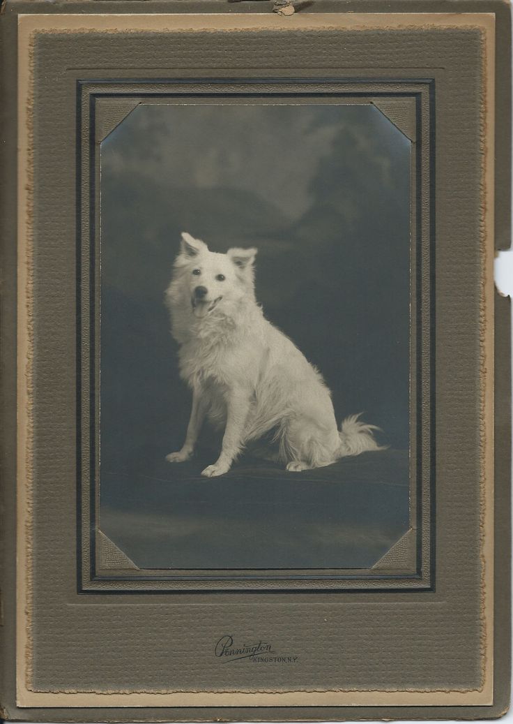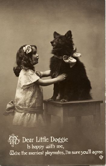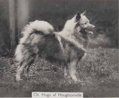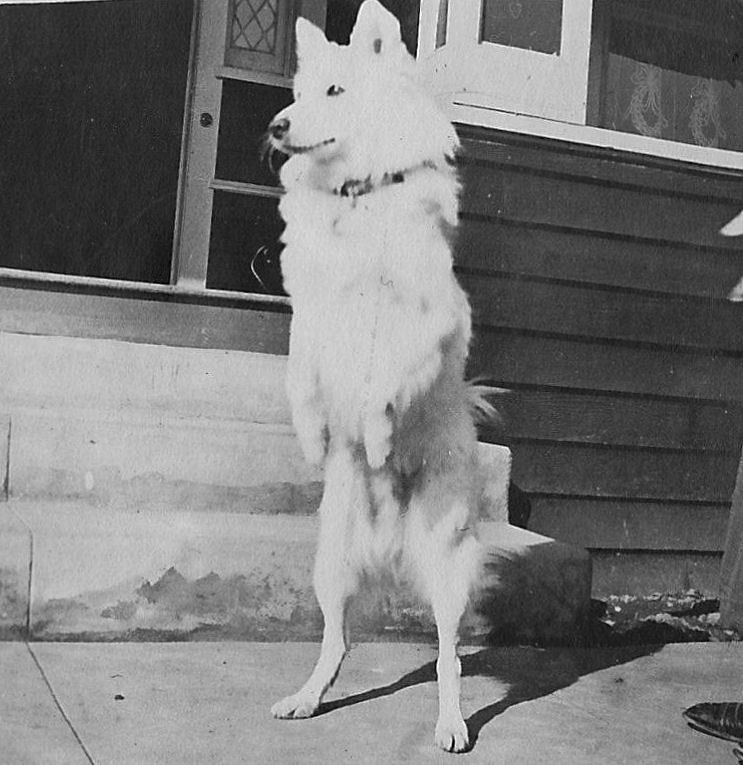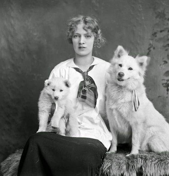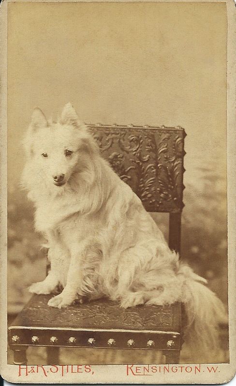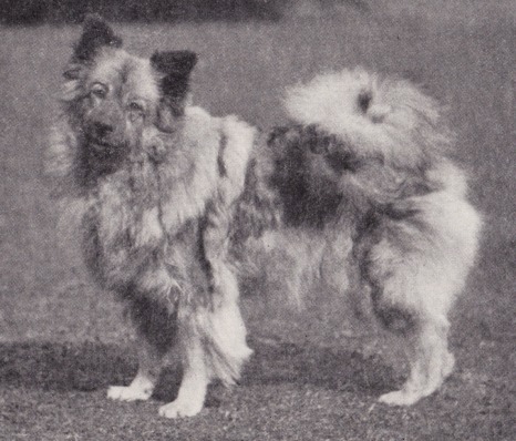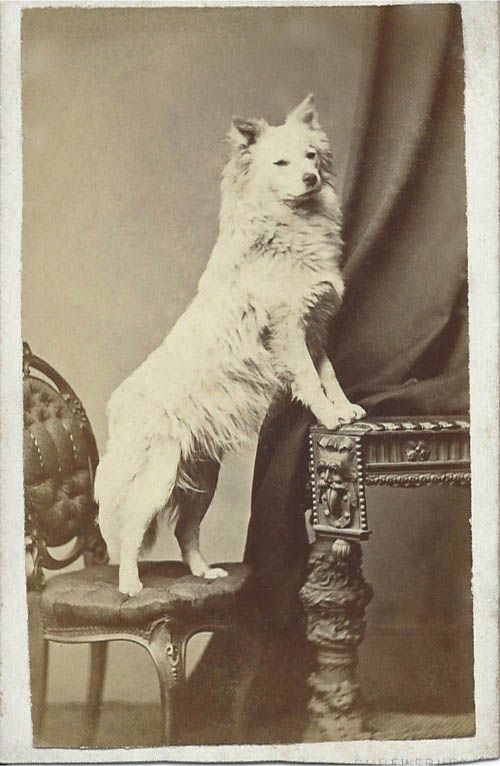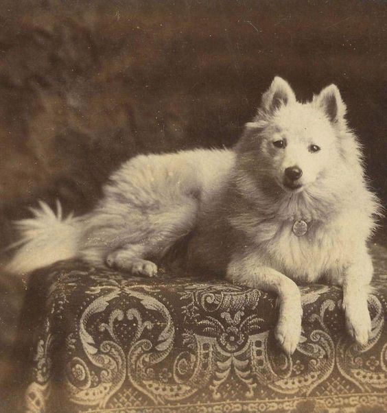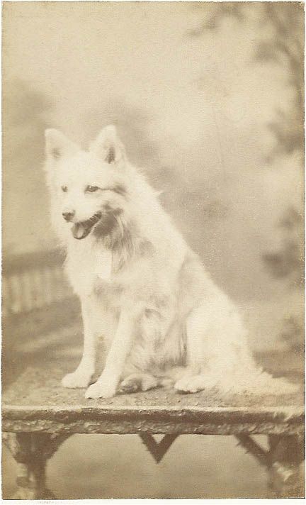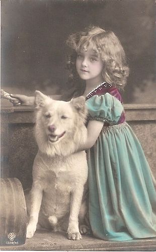 Diese Seite präsentiert eine Galerie historischer Fotos und Postkarten, auf denen Spitze und spitzartige Hunde abgebildet sind.