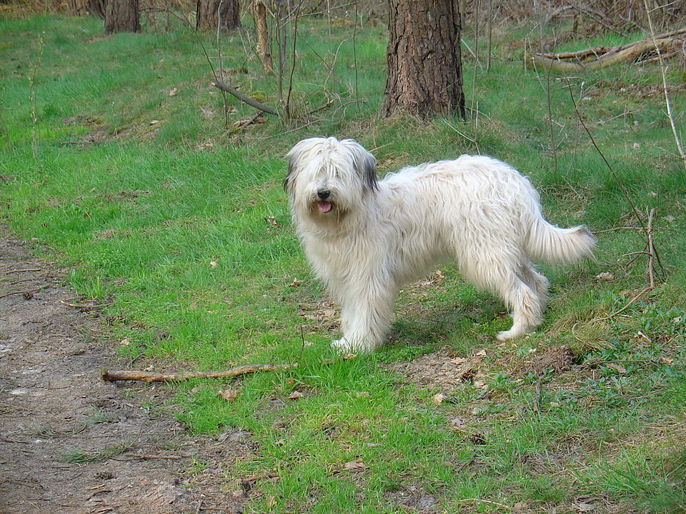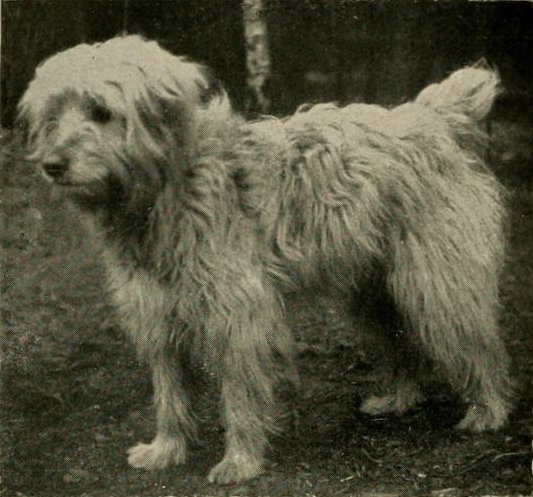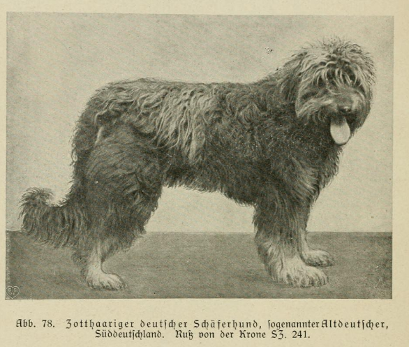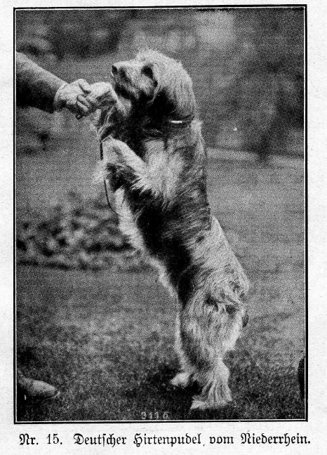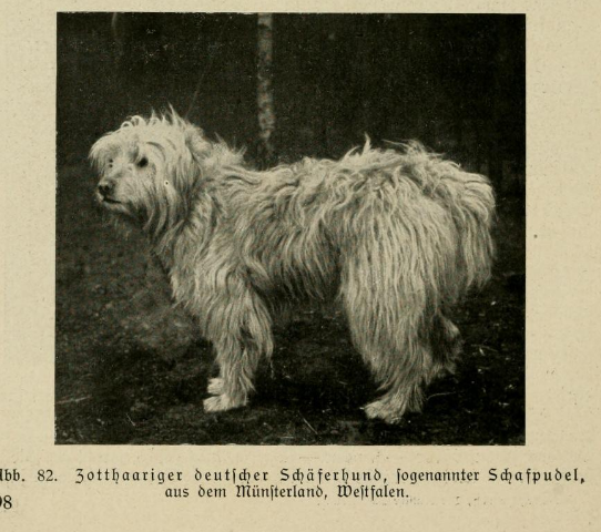„Bei dem zotthaarigen Schlage dichtes, langgewelltes, rauh anzufühlendes Haar: das reichliche Kopfhaar fällt, die Augen teilweise bedeckend, nach allen Seiten ab und bildet einen die Schnauze bekleidenden Lippen- und Knebelbart. Die Pfoten sind lang behaart, an der Rute eine Fahne. Die innere Behaarung der Hängeohren ist gleichfalls zotthaarig.“ 10