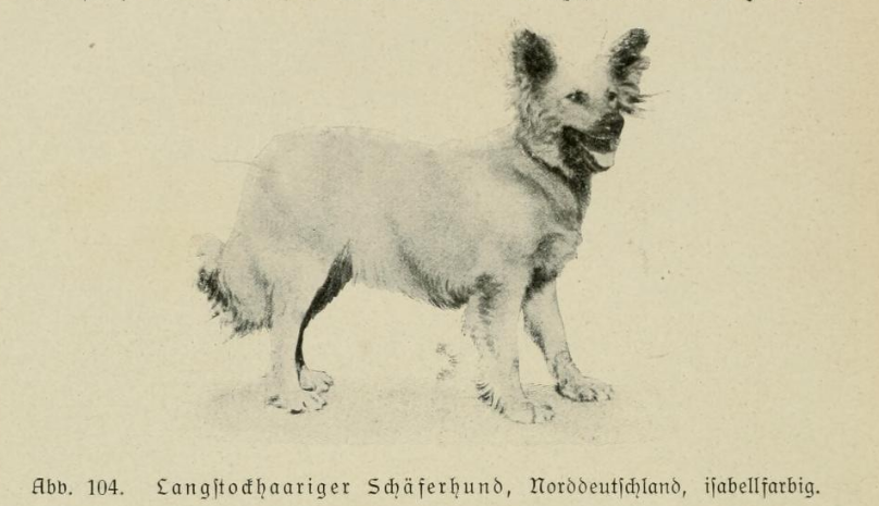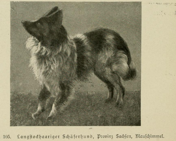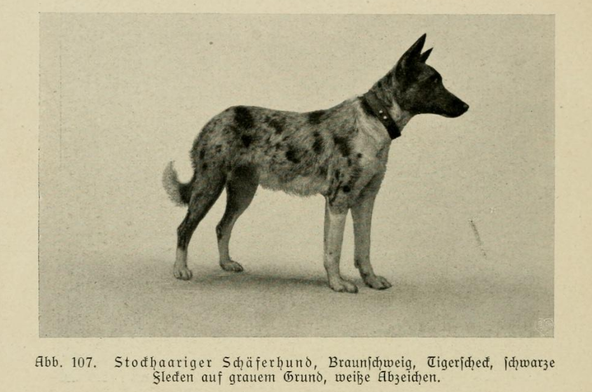 „Schimmel waren früher unter den Gebrauchshunden Nord- und Mitteldeutschlands häufiger und zwar als Blau- oder Rotschimmel. Im Braunschweiglichen gab es auch noch eine eigenartige Tigerscheckenfärbung, auf die einzelne Schäfereien besonders hielten. Eigentliche Tiger, geströmte Hunde, findet man im Süden häufiger.“ 13