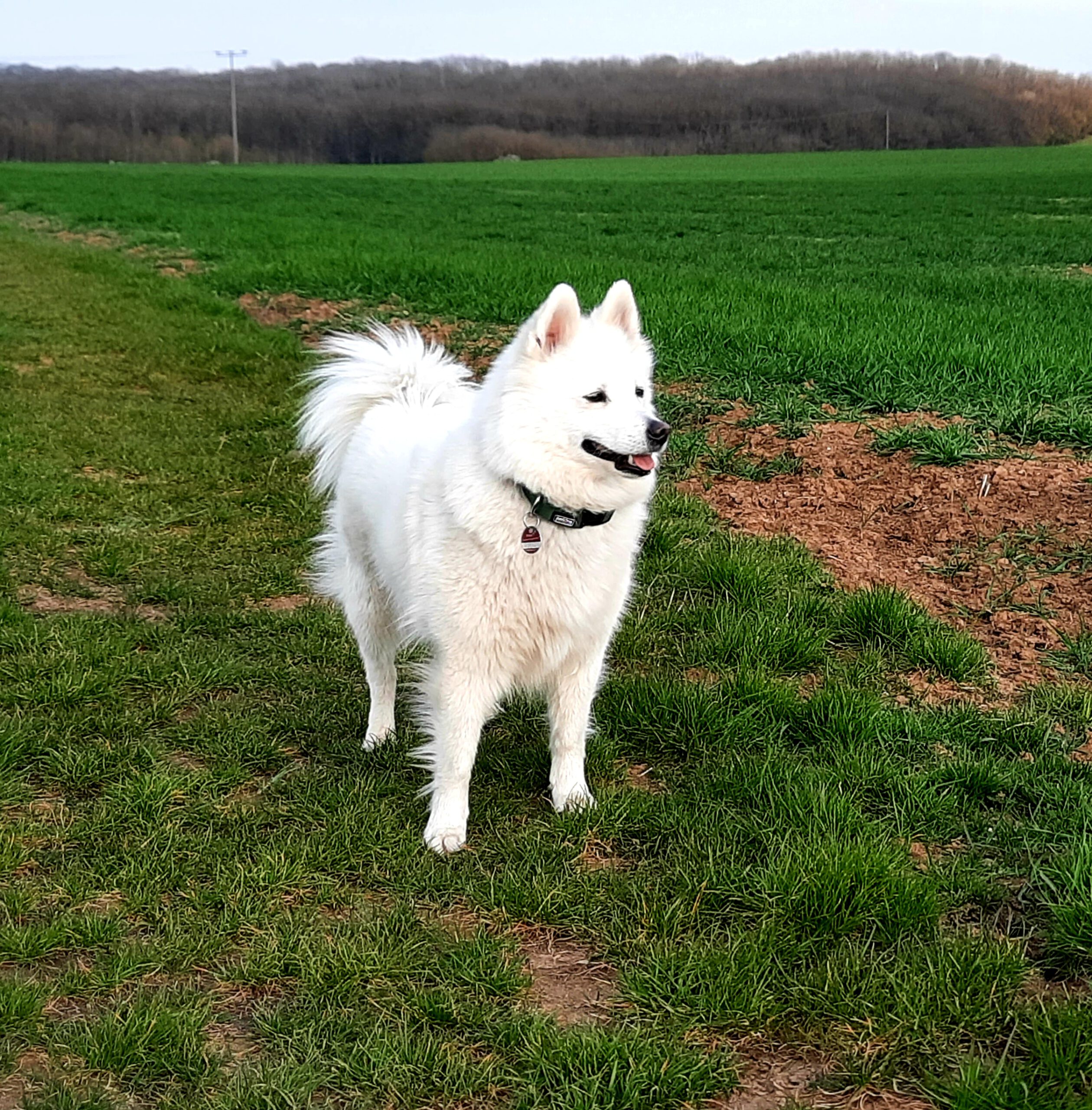 Finja gehört zu den kleineren Vertreter der Großspitze mit 42cm Rückenhöhe. Sie hat ein sehr schönes weiches Fell, jedoch nicht sehr üppig. Sie ist eine sehr lebhafte und quirlige Hündin.